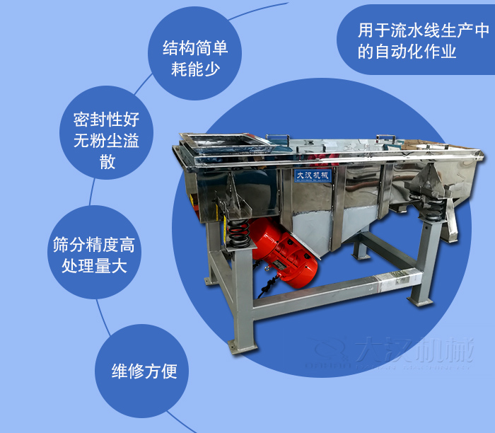 產(chǎn)品介紹:該機(jī)為DZSF-530-1S型直線振動篩,一層兩個出料口,整機(jī)為304材質(zhì),出料口根據(jù)客戶要求,特殊定做,該設(shè)備篩分精度高、處理量大、結(jié)構(gòu)簡單、耗能少、噪音低、篩網(wǎng)使用壽命長、密封性好、無粉塵溢散、維修方便、可用于流水線生產(chǎn)中的自動化作業(yè)