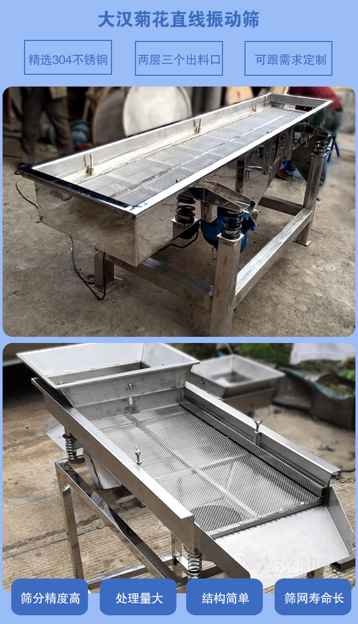菊花為菊科植物的干燥頭狀花序。主產(chǎn)于浙江、安徽、河南等地。9-11月花盛開時分批采收,陰干或焙干,或熏、蒸后曬干。生用。藥材按產(chǎn)地和加工方法不同,分為“亳菊”、“滁菊”、“貢菊”、“杭菊”等。由于又有花的顏色不同,又有黃菊花和白菊花之分。 菊花在做成成品之前,需要進(jìn)行除雜分級。這時候就需要用到直線振動篩,菊花直線振動篩篩分精度高,處理量大,結(jié)構(gòu)簡單,篩網(wǎng)使用壽命長,下面有菊花直線振動篩廠家大漢機(jī)械為您具體介紹一下菊花直線振動篩: