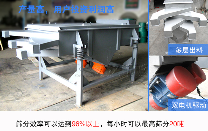 我們的直線式振動篩采用雙胎電機(jī)驅(qū)動,篩分效率更高,多層篩網(wǎng)同時篩分,大單臺機(jī)器可分選出6到7個不同粒度的物料,滿足不同客戶的需要,篩分效率可以達(dá)到96%以上,每小時可以高篩分20噸。而且,大漢廠家還根據(jù)客戶的情況設(shè)計(jì)針對性的解決方案,為客戶創(chuàng)造更大收益,降低運(yùn)營成本,但是直線式振動篩價格需要根據(jù)用戶實(shí)際情況決定。
