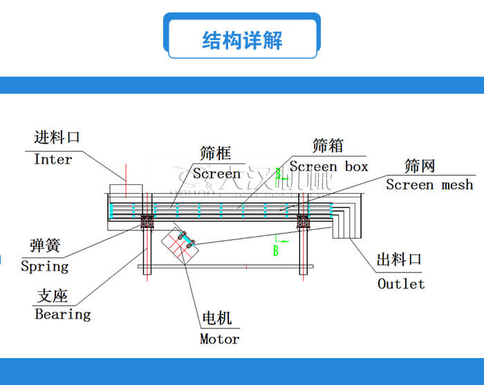 主要由篩箱、篩框、篩網(wǎng)、振動電機、電機臺座、減振彈簧、支架等部分組成。