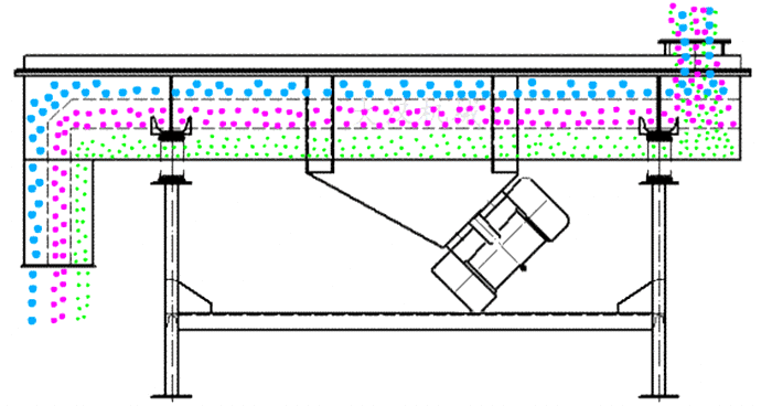 高頻直線篩采用雙振動電機驅(qū)動,當(dāng)物料從給料機均勻地進入篩分機的進料口,在振動電機的激振下,向出料口方向邊跳動邊篩分,通過多層篩網(wǎng)篩分出數(shù)種產(chǎn)品和不合格的篩上、篩下物,分別從各自的出口排出,流入料倉或盛料筒,從而達到對物料進行篩選和分級的目的。