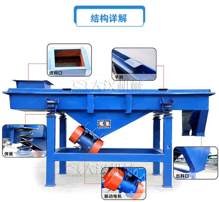 高頻直線振動篩主要由篩箱、篩框、篩網(wǎng)、振動電機、電機臺座、減振彈簧、支架等組成。