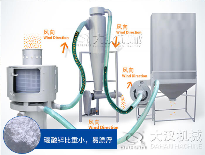 硼酸鋅粒度較小,篩分目數(shù)般比較精細(xì),所以使用普通振動篩難以解決物料易漂浮這難題,而氣流篩通過螺旋輸送系統(tǒng)后,和氣流混合、霧化進(jìn)入網(wǎng)筒內(nèi),通過網(wǎng)筒內(nèi)風(fēng)輪葉片使物料同時受離心力和旋風(fēng)推進(jìn)力,從而近使物料噴射過網(wǎng),由細(xì)料排出口排出,不能過網(wǎng)的物料沿網(wǎng)筒壁從粗料排出口排出,可以解決硼酸鋅易于漂浮這問題。