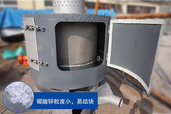 由于硼酸鋅密度般比較小,所以在篩分過程中容易粘在篩網(wǎng)上或造成結(jié)塊,嚴(yán)重影響篩分效率和精度,氣流篩風(fēng)輪葉片的高速旋轉(zhuǎn)可以使結(jié)塊物料被打碎,相當(dāng)于臺破碎機(jī)和臺篩分機(jī)的組合,提高了篩分效率。