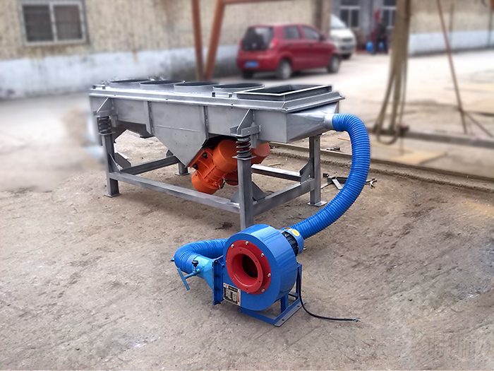 大漢機(jī)械降溫直線振動篩這對高溫特性物料設(shè)計研發(fā),可在有效降低物料溫度后再對物料進(jìn)行篩分,有效的提高了篩分效率及處理量,下面以洗衣粉為例說明風(fēng)冷式振動篩的應(yīng)用。洗衣粉在剛剛完成生產(chǎn)后,通常為120度左右的高溫,如不進(jìn)行降溫處理,篩選分級非常困難,而洗衣服不適合傳統(tǒng)的水冷式降溫。在洗衣粉生產(chǎn)線上用“大漢牌”降溫式直線振動篩,剛生產(chǎn)完成120度高溫洗衣粉通過輸送設(shè)備直接進(jìn)入風(fēng)冷式直線振動篩,經(jīng)過安裝在設(shè)備進(jìn)料口底部的風(fēng)機(jī)降溫冷卻系統(tǒng),(不符合要求的結(jié)塊物料通過安裝在進(jìn)料口端的篩網(wǎng)篩選后從出料口旁的小型排料口排出,見下圖,該裝置可根據(jù)物料特性選裝),可直接將洗衣粉溫度降至40-50度后再進(jìn)入直線振動篩完成篩選分級工作。