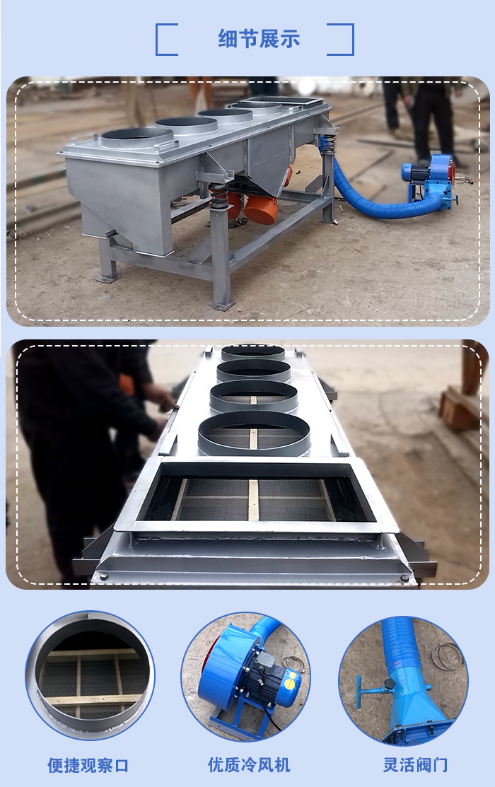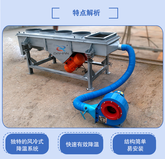 2、獨(dú)特的風(fēng)冷式降溫系統(tǒng)設(shè)計,快速有效降溫,降溫后篩分效率更高;